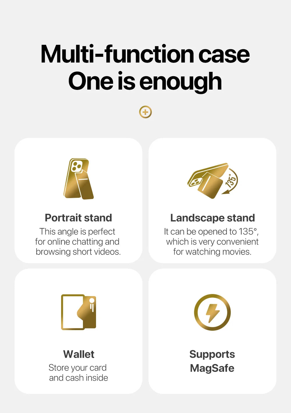 - Combines a phone case, wallet, and stand into one compact accessory.